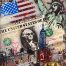 Acrylfarben, Spraylack und Tüten auf Leinwand